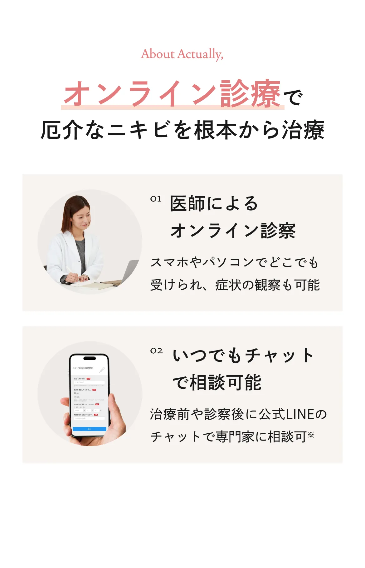 Actually,は、オンライン診療を提供するプラットフォームサービスです。提携する医療機関・医師があなたに合った治療プランを提案・処方し、お薬をご自宅に配送します。