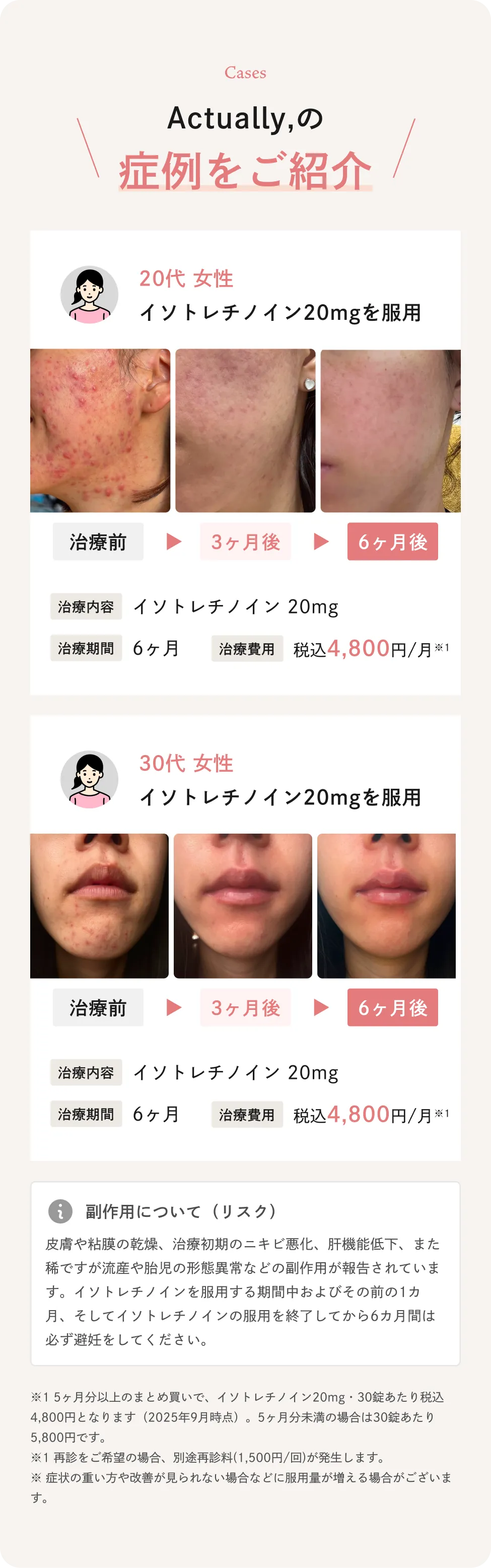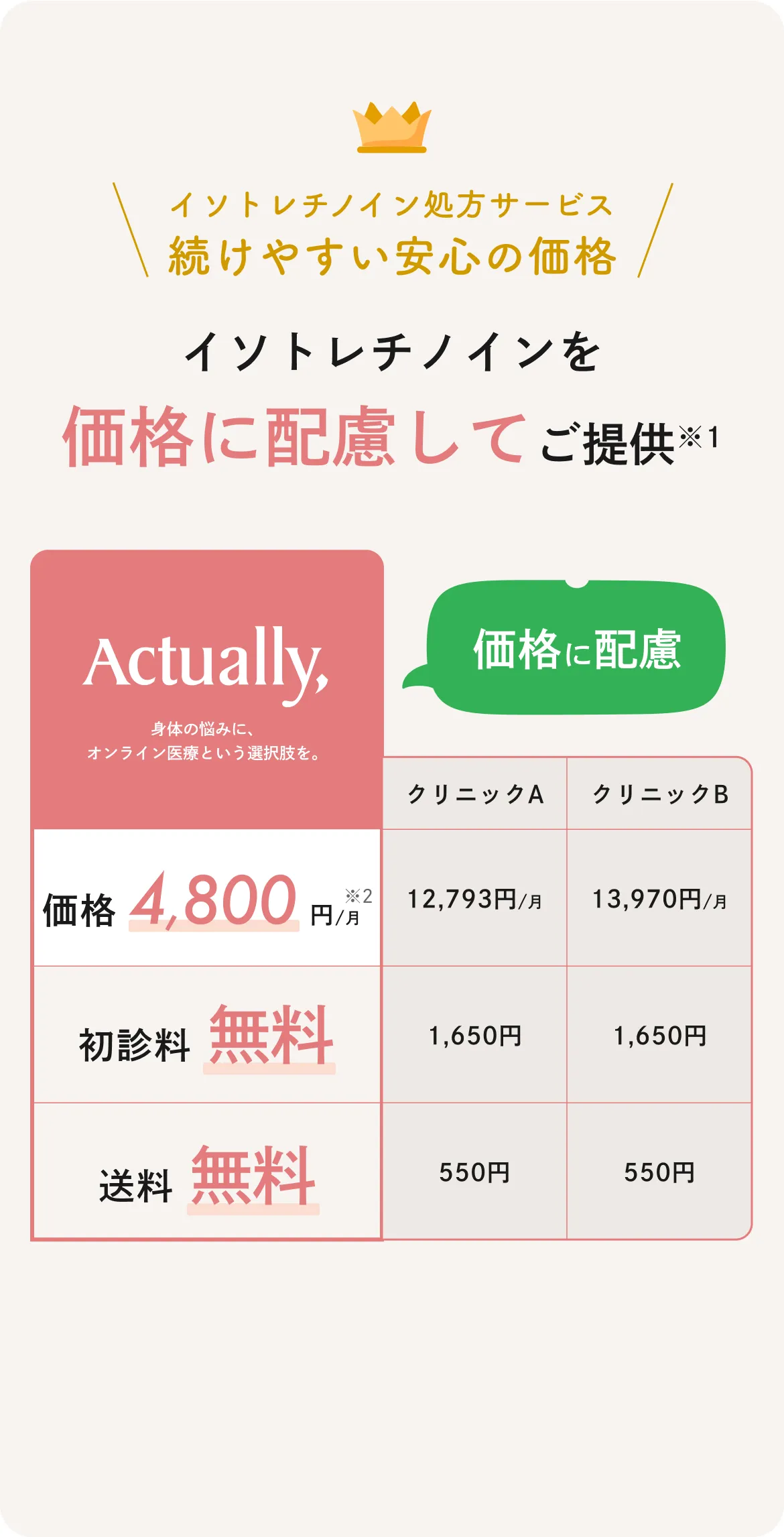 ※1 2025年5月時点で、国内のオンライン診療サービスを利用してイソトレチノイン20mg/日を処方された際の1ヶ月あたりの総費用(薬代、診察料、送料、血液検査料等を含む)を、当社が独自に実施した調査に基づいて比較しています。