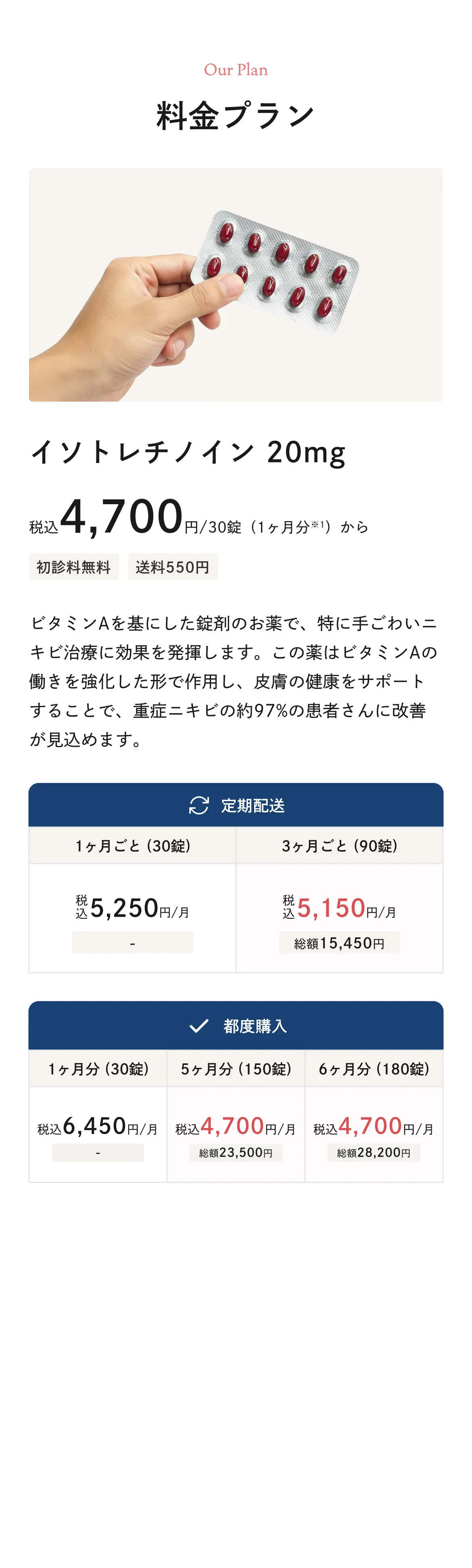 ※1 症状の重い方や改善が見られない場合などに服用量が増える場合がございます。再診をご希望の場合、別途再診料(1,500円/回)が発生します。なお一度処方されたお薬の追加購入には再診は必須ではございません。